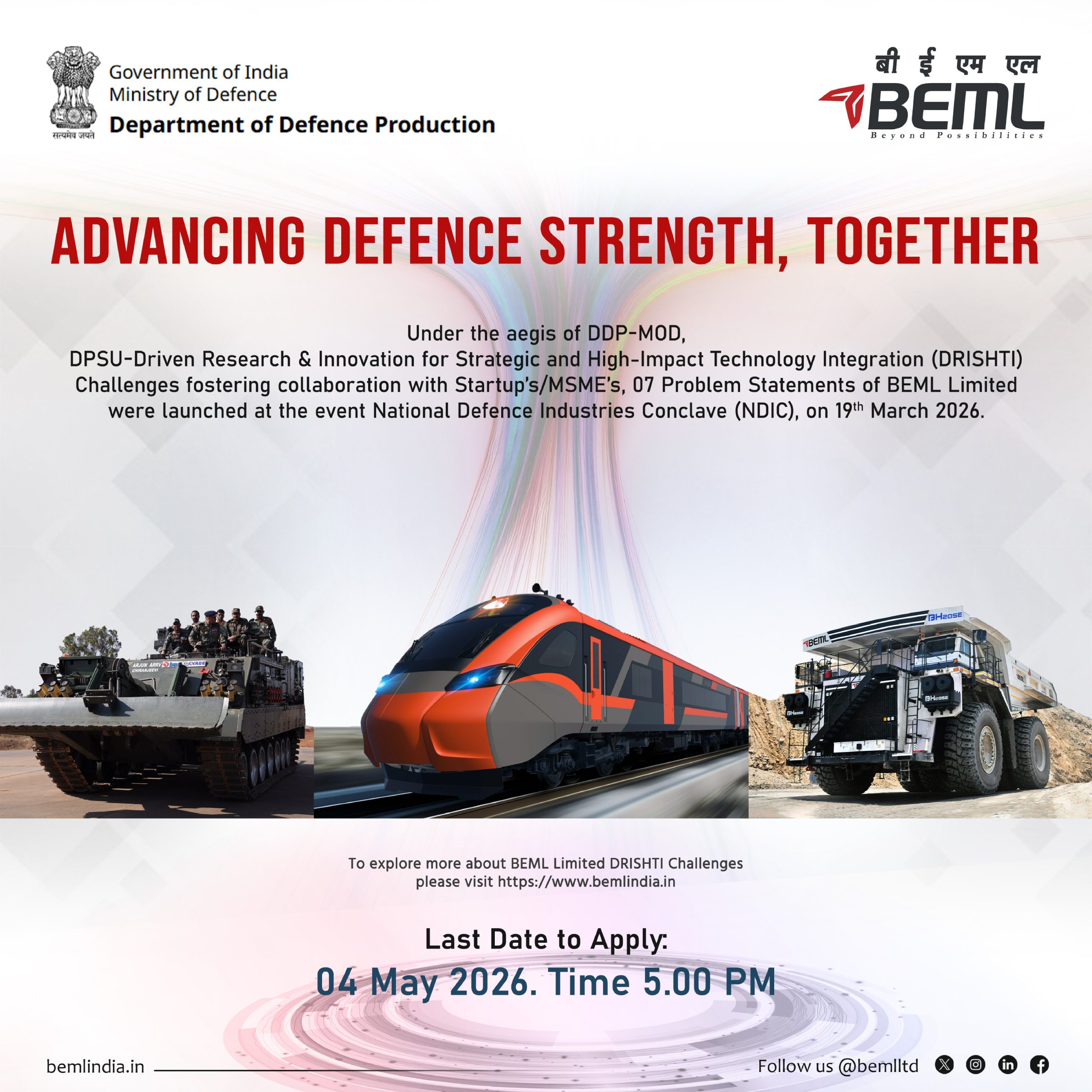 BEML Limited, a ‘Schedule ‘A’ Company under Ministry of Defence, Govt. Of India, plays a pivotal role and serves India’s core sectors like Defence, Rail, Power, Mining and Infrastructure.